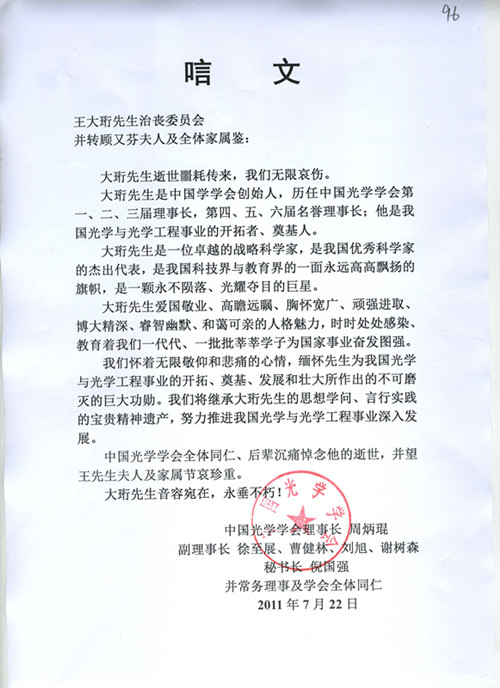 中国光学学会唁电