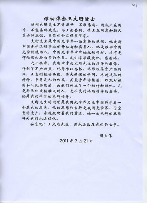 北京光学学会理事长、中国工程院院士周立伟唁电