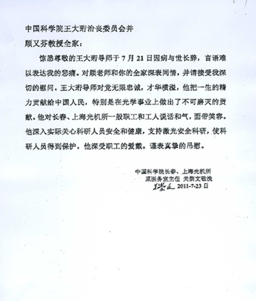 中科院长春、上海光机所原医务室主任关崇文唁电