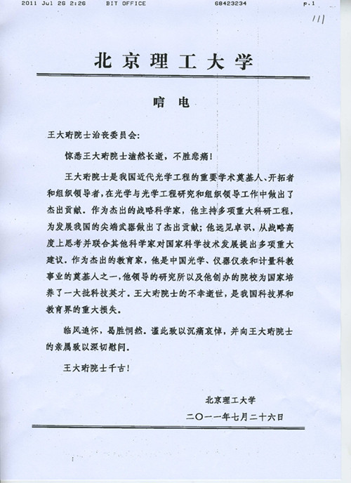北京理工大学唁电