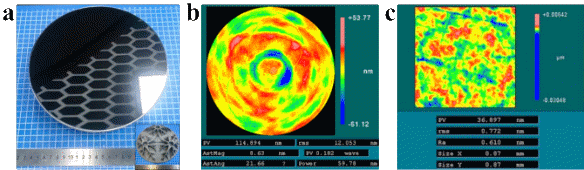 实验结果表明,该方法可使碳化硅含量提升18.18%(46.36%→64.54%),并实现全链路尺寸变形量低于0.5%的直径220 mm拓扑结构碳化硅镜体研制,经加工后光学表面面形精度优于λ/50 RMS(λ=632.8 nm),粗糙度为0.772 nm。该研究为增材制造碳化硅陶瓷性能强化奠定了理论基础,对碳化硅光学反射镜的短周期、低成本研制具有指导意义。