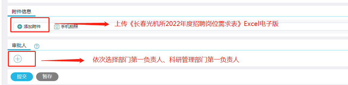 流程如下图:1.点击“回复”;2.上传《长春光机所2022年度招聘岗位需求表》(附件1);3.并在审批人依次选择部门第一负责人、科研管理部门第一负责人,无需纸质签字文件。