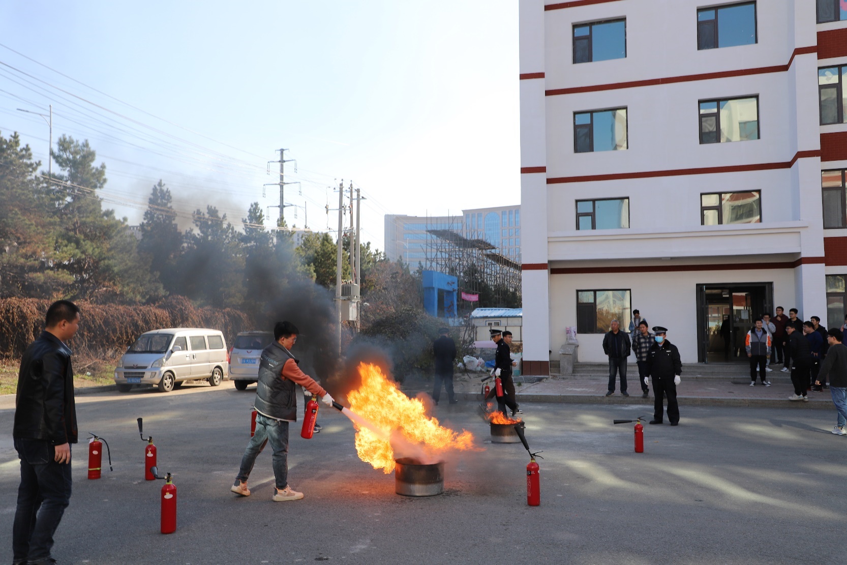 随后,参演人员在公寓C座门前集中接受了二氧化碳灭火器使用范围、方法及注意事项等知识培训,并进行了灭火实战演练。