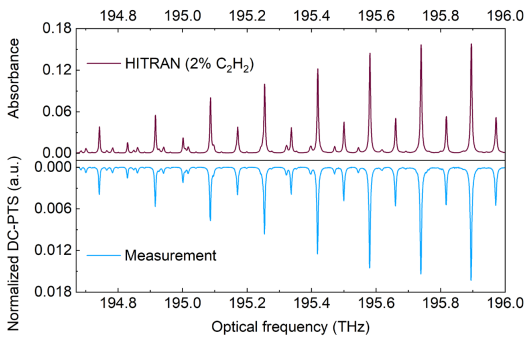 在原理验证实验中,研究人员采用电光调制器产生了具有天然内禀互相干的双光梳泵浦激光,用一根7cm的反谐振空芯光纤构建了全光纤Fabry–Pérot干涉仪,仅用mW量级的激光便可实现kW·cm-2量级的泵浦光强。在空芯光纤28μm的空间尺度内,该光梳可同时以上百个不同频率对气体折射率进行调制,对0.17μL采样体积的气体实现了ppm级的探测灵敏度和超过1THz谱宽的光热光谱测量(如图2所示)。