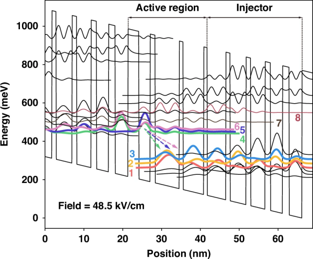 本研究团队提出了一种基于对角跃迁的多能态-连续态(MTC)有源区设计方案,该结构采用应力补偿材料体系构建。经优化设计后,两个注入区能级(4和6)与有源区的上激光能级5形成了强耦合。电子可通过三个上激光能级(4-6)向下激光能级(1-3)进行对角跃迁,多个跃迁通道同时贡献增益,显著拓宽了有源区的增益带宽。
