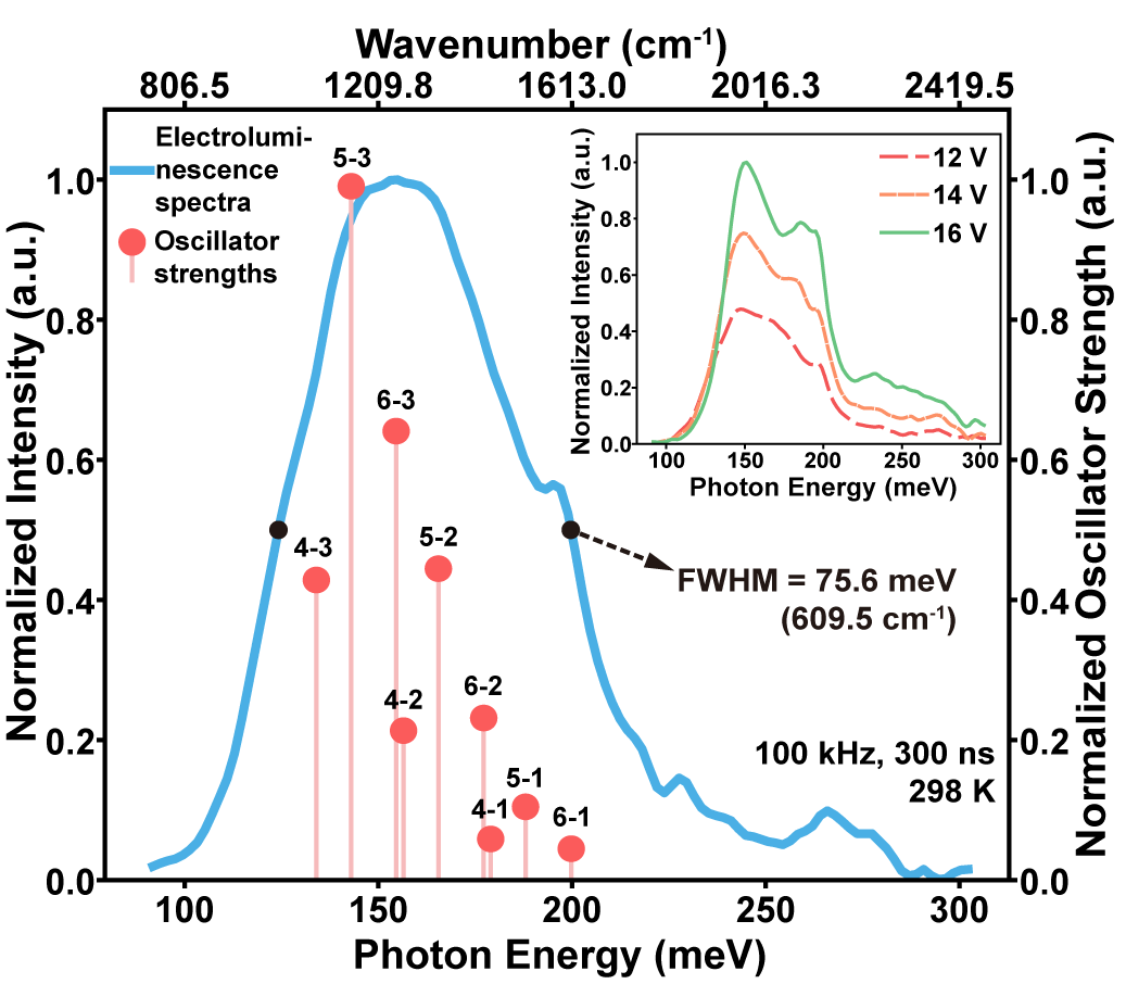 受限于有源区能带工程的设计复杂性,当前长波红外单有源区量子级联激光器的电致发光光谱半高全宽(FWHM)普遍低于600 cm-1(可以实现的光谱宽度远不足1 μm),严重制约了其在宽带光谱调控与精密测量等场景中的应用潜力。