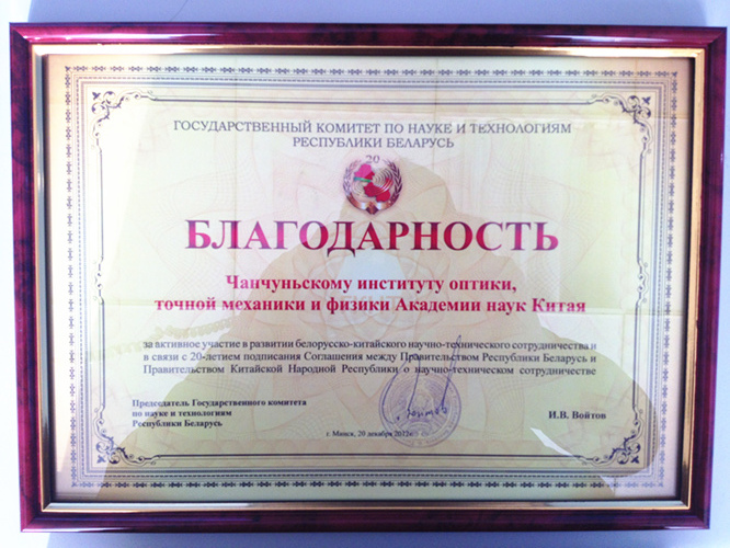 作为论坛的一项重要内容,大会为中白双方18个单位颁发了由白俄罗斯国家科学技术委员会颁布的奖状,旨在表彰那些在双方科技合作中取得突出成果的单位。中科院长春光机所与哈尔滨工业大学、山东省科学院等其他8家国内单位共同获此殊荣。其中,中科院长春光机所是中国科学院唯一一家获奖单位。