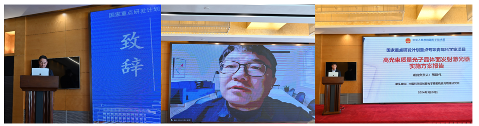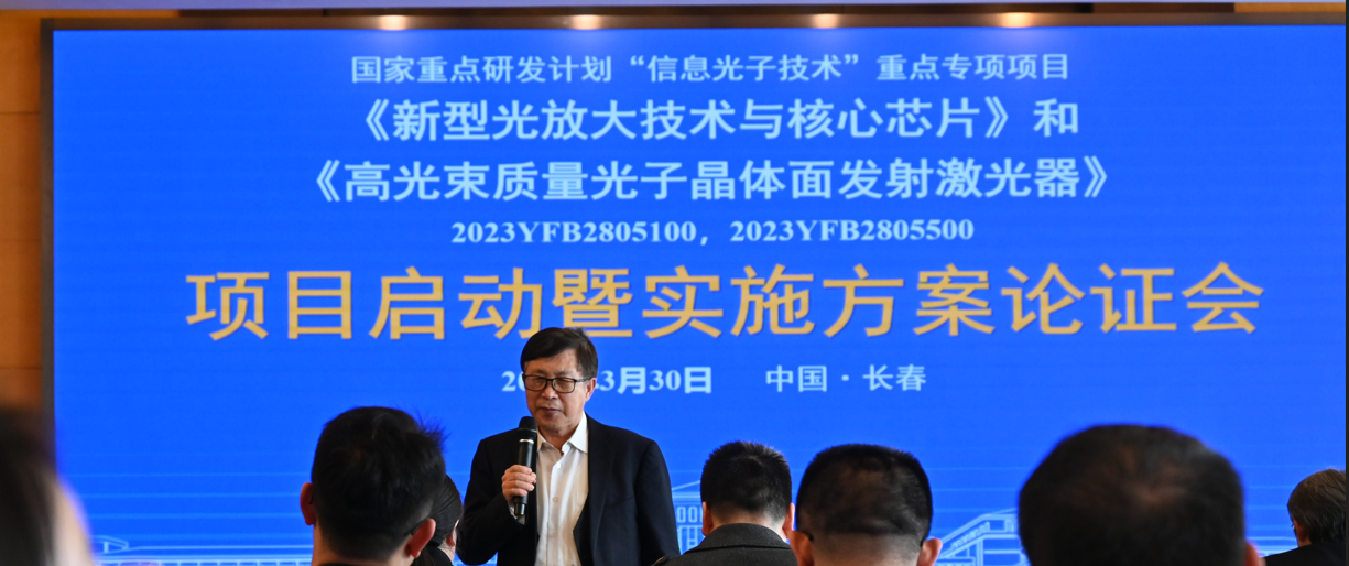 2024年3月30日,我所大功率激光团队张建伟研究员承担的国家重点研发计划青年科学家项目“高光束质量光子晶体面发射激光器”项目启动会在长春南湖宾馆召开。长春光机所大功率半导体激光团队学术带头人王立军院士、东北师范大学刘益春院士、吉林大学党委常务副书记冯正玉、长春光机所所务委员黎大兵、吉林省科技厅高新处一级调研员杨景鹏参加会议。同时召开的还有科技部重点研发计划项目“新型光放大技术与核心芯片”项目启动会,该项目两项课题由团队宁永强研究员、长光时空总经理张星以及陈超副研究员、周寅利副研究员等承担。